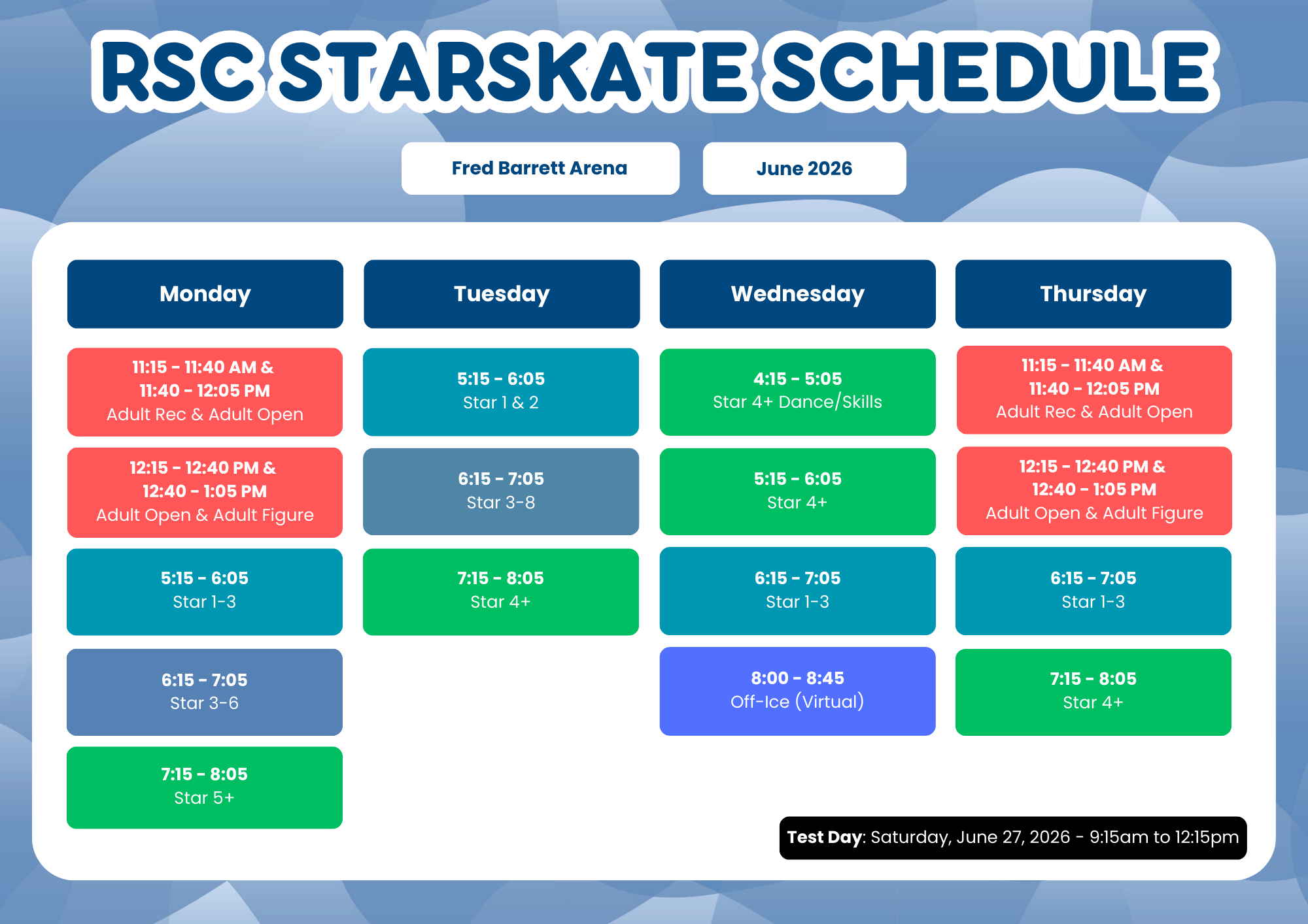 All skating sessions will be located at Fred Barrett Arena from April 1 through April 30. Please refer to RSC Weekly for session details.
